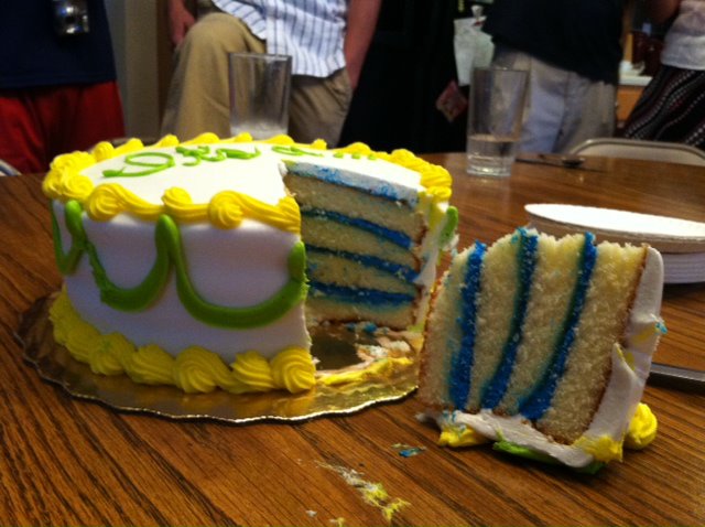 We didn't find out if Jack was a boy or girl until he was born and we kept going back and forth about finding out this time. To find out in the doctor's office seemed kinda anti-climactic, so we decided to take the gender in a sealed envelope to Publix. They colored the icing that held the layers together either pink for a girl or blue for a boy. When we cut into the cake, we saw BLUE!!! This was a very exciting way to find out! And we got to share this experience with Luke's parents, Laura's mom, Uncle Nick, Aunt Liz, Uncle Zack, and Uncle Caleb!